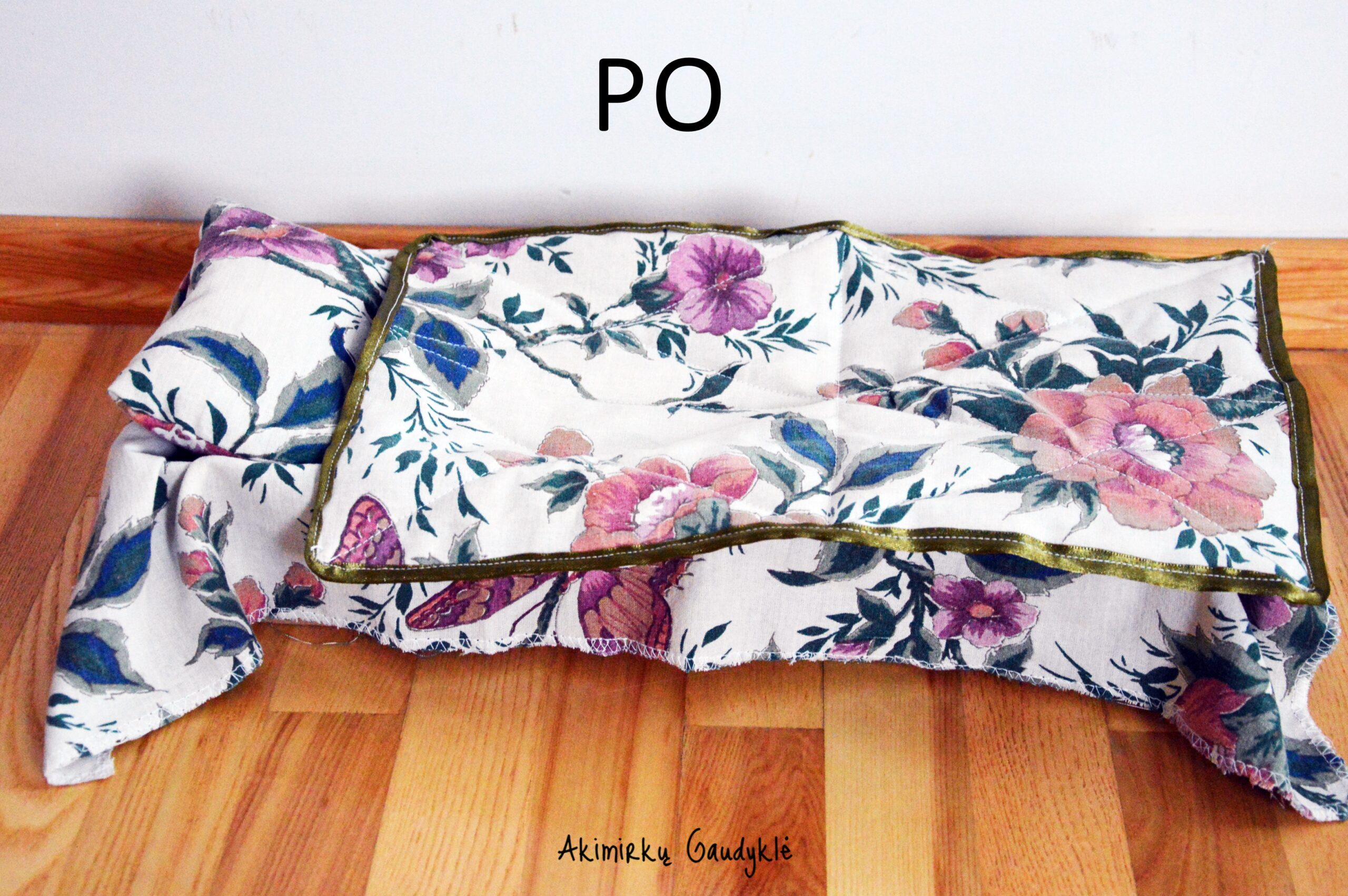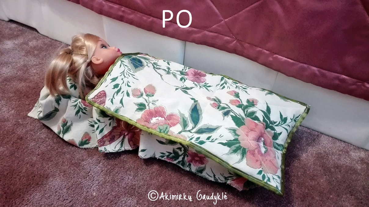 Patalynei pasiūti panaudota užuolaida. O į patalynės komplektą įeina paklodė, kimštas čiužinukas, kimšta pagalvėlė, dygsniuota antklodė. Viskas, ko reikia išmokti pasikloti tikrą lovą 🙂