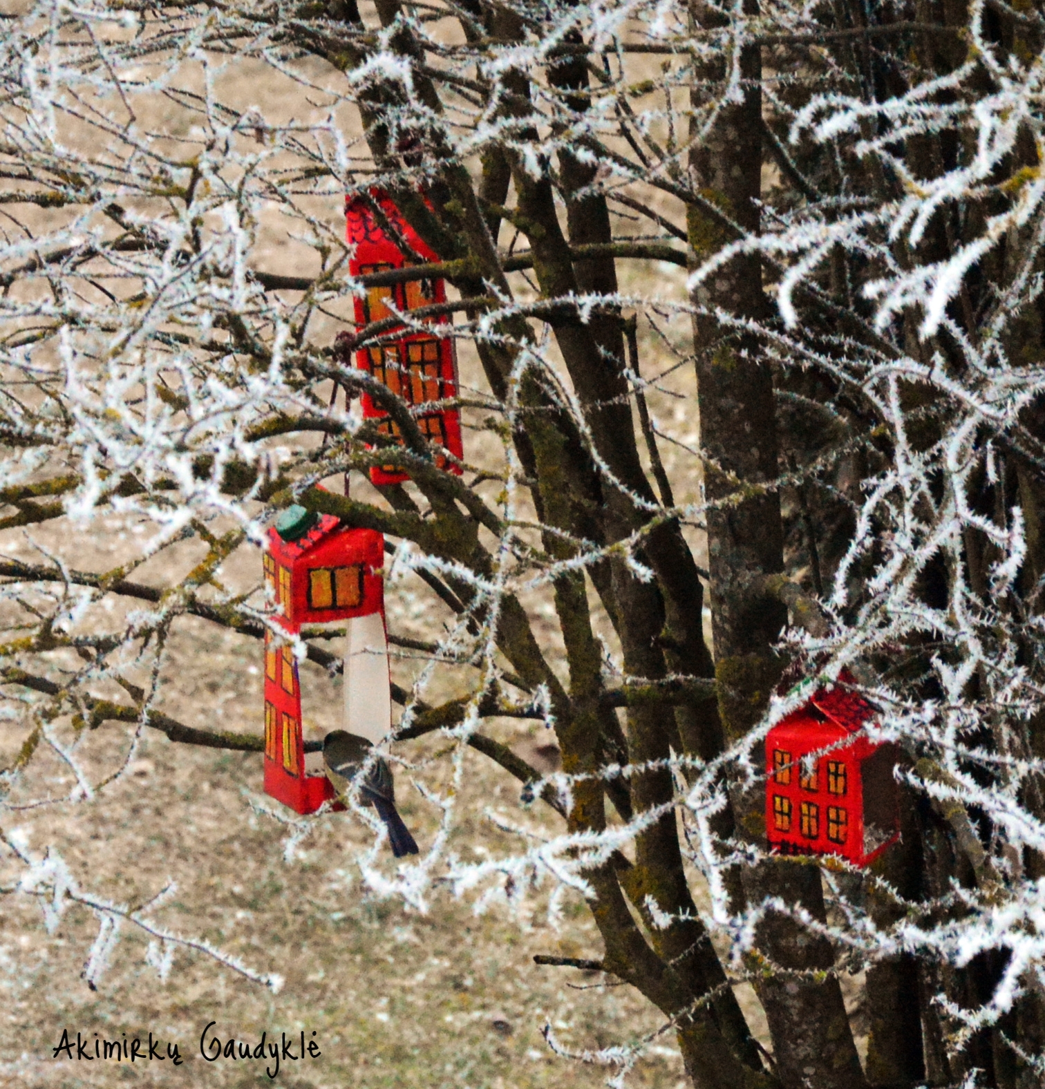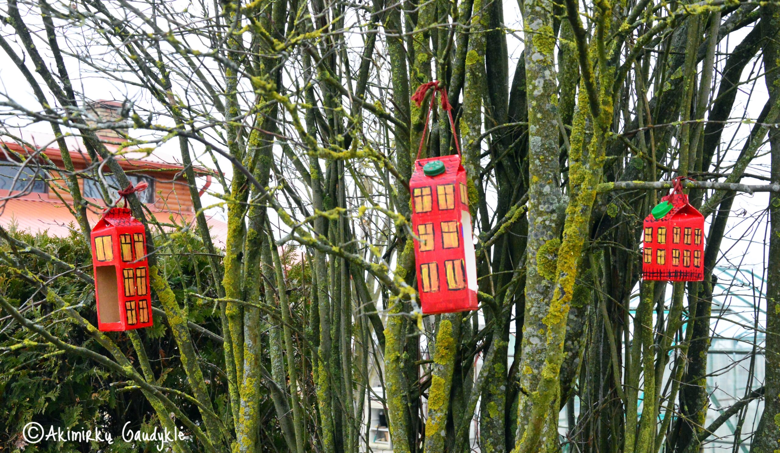 Pieno pakelyje išpjaukite kiaurymes. Svarbu palikti virš dugno neatpjautą kokių 2-3 cm kraštelį (kad neišbyrėtų lesalas). Dažykite pieno pakelio lesyklėlę akriliniais dažais pagal savo vaizduotę. Aš prigaminau namuko pavidalo lesyklėlių. Patariu kabinti kuo stabiliau, tokioje vietoje, kad angelė būtų šalia šakos ir paukštukui būtų patogu pasičiupti saulėgrąžą, o lesyklėlė stipriai nejudėtų.